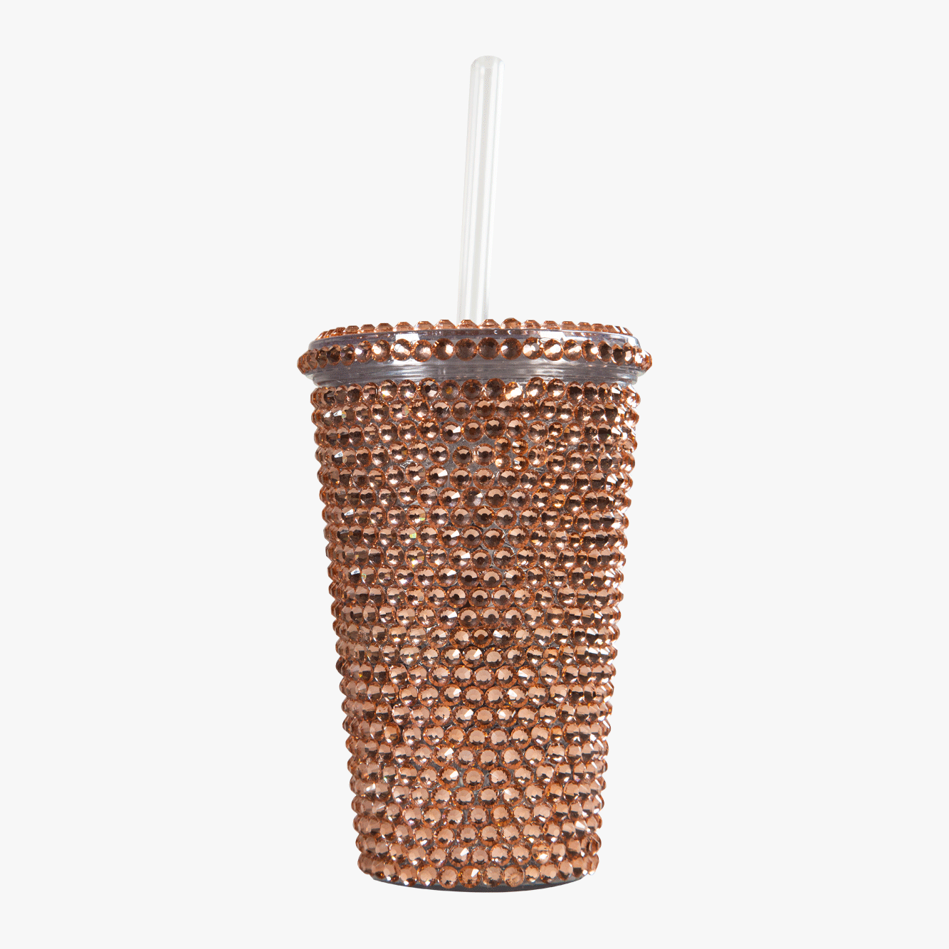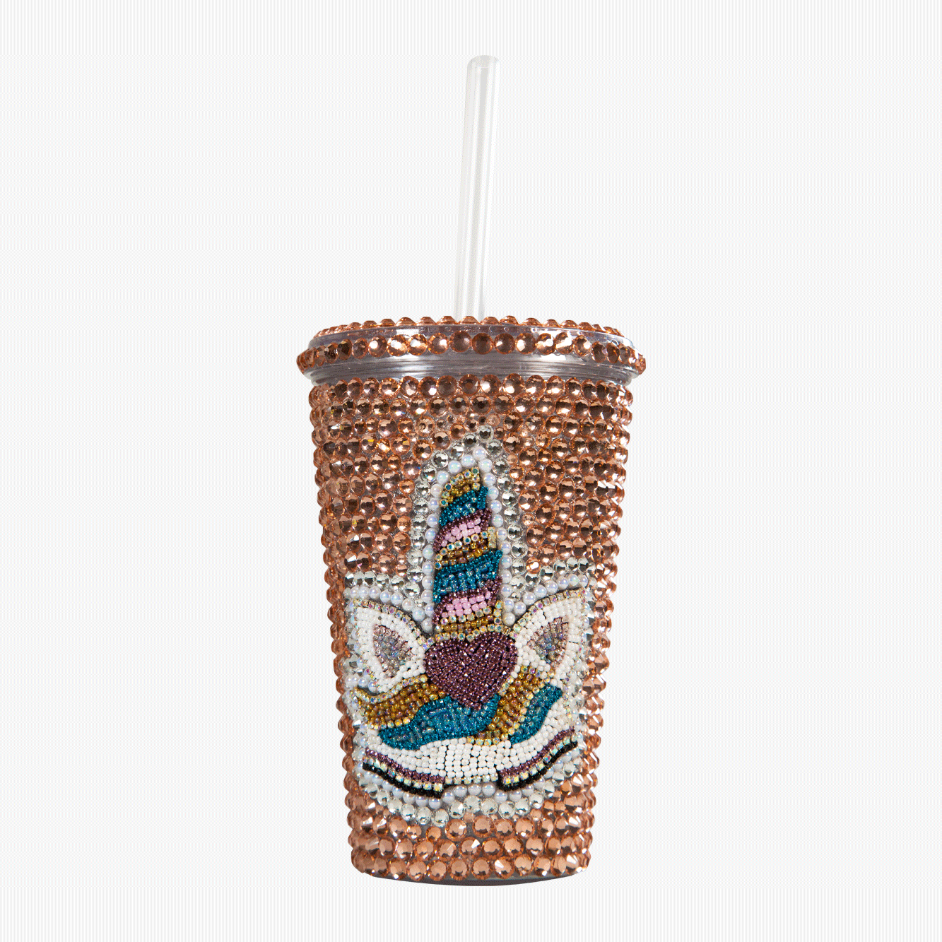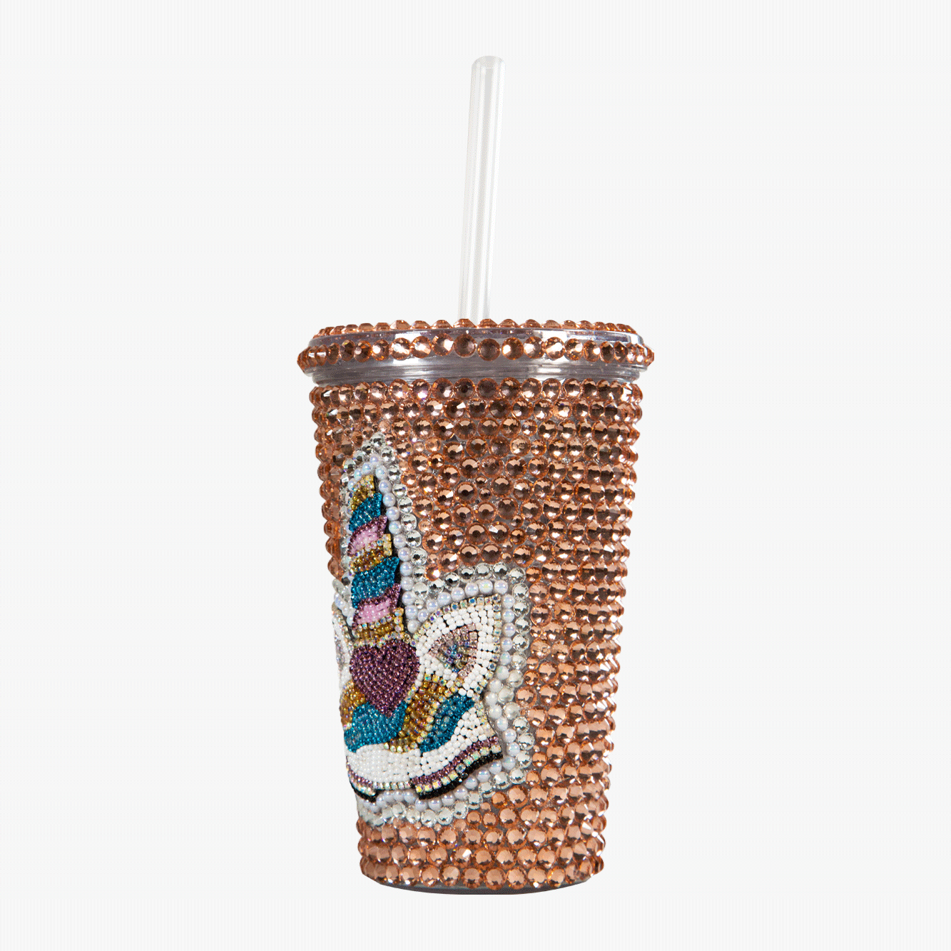 Vaso de acrílico de doble pared con popote incluido para Pinky Drink decorado con lágrimas de unicornio cristalizadas de color Rosa Oro.
